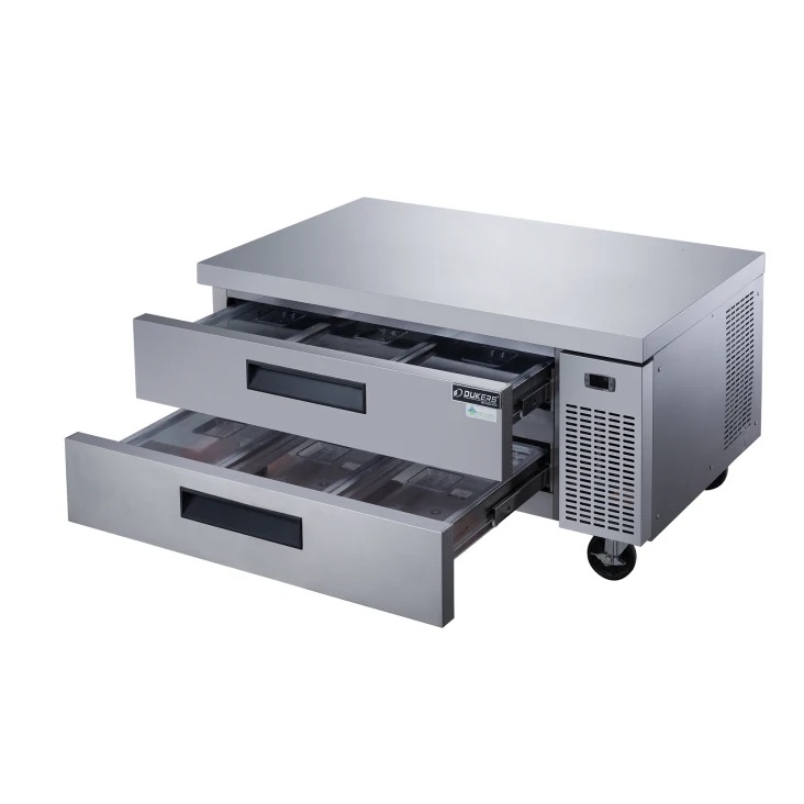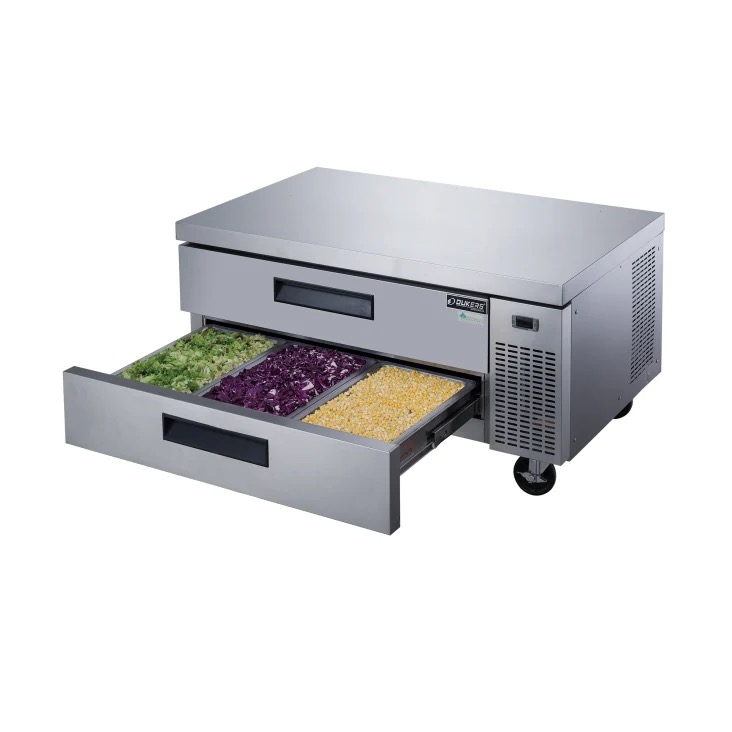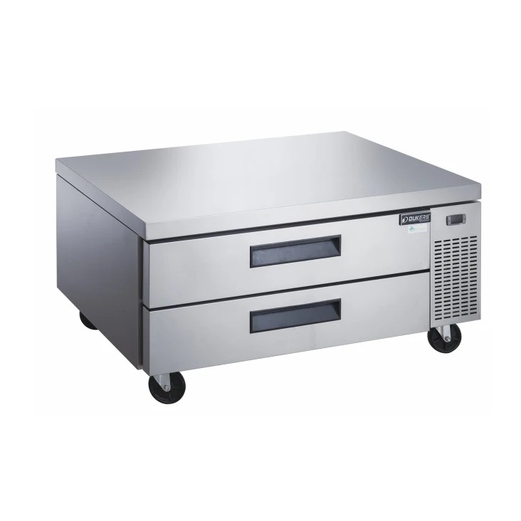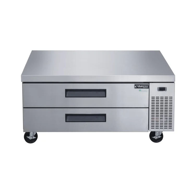 The Dukers DCB48-D2 Chef Base Refrigerator with 2 Drawers is a robust refrigeration solution tailored for commercial kitchen environments. With two drawers and dimensions of 48″ x 32 1/4″ x 26 5/8″, it offers ample storage space while seamlessly integrating into kitchen layouts. Its temperature range of 33~38°F, automatic defrost, and digital temperature control ensure precise temperature management for optimal food preservation. Constructed with stainless steel interior and exterior, along with rounded corners for easy cleaning and sanitation compliance, it prioritizes durability and hygiene. Featuring foamed-in-place insulation for structural strength and heavy-duty 4″ casters with brakes for convenient mobility, cleaning, and servicing, it provides both functionality and convenience. Ergonomic recess door handles and removable drawer gaskets further enhance ease of use and maintenance. Backed by a warranty for commercial use, this chef base refrigerator is a reliable choice for commercial kitchens seeking performance and longevity.
